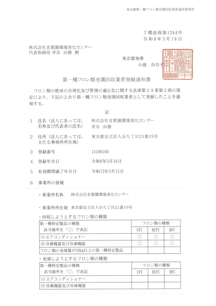 「第一種フロン類充塡回収業者」として登録されました