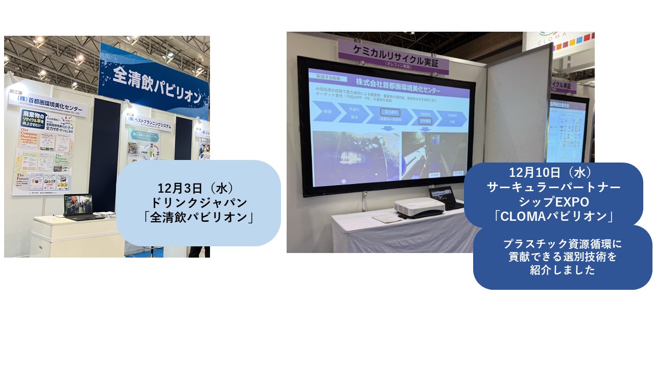 2025年12月10日(水)、東京ビックサイトで行われた「サーキュラーパートナーシップEXPO」において、CLOMA(クリーン・オーシャン・マテリアル・アライアンス)様が出展された「CLOMAパビリオン」に「大都市圏での資源循環システム構築に向けた実証事業」を紹介するエリアが設けられました。弊社は、プラスチックのケミカルリサイクルに繋がる中間処理を紹介する機会をいただき、選別技術の紹介をいたしました。